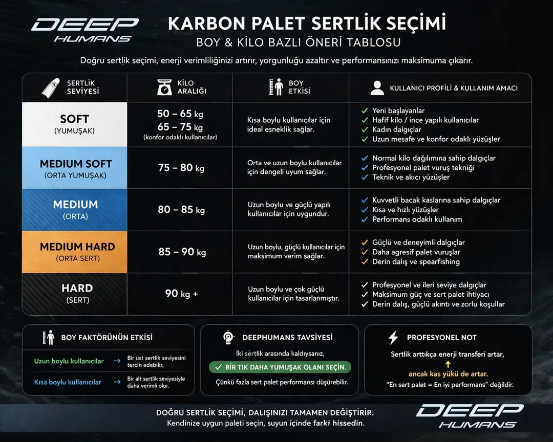 Deephumans Karbon Paletler, %100 karbon kumaş teknolojisi ve yılların deneyimiyle geliştirilmiş yapısıyla, su altında maksimum verimlilik ve akıcı hareket sağlar.